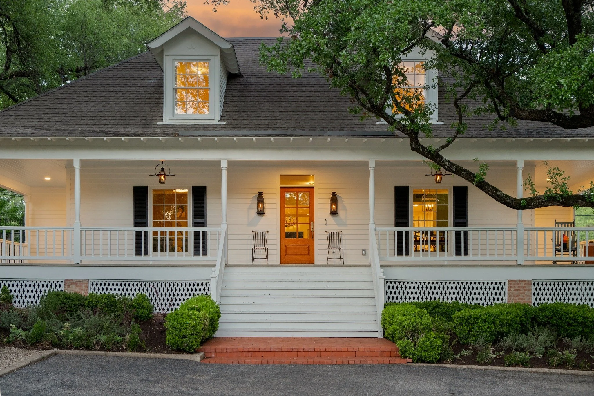 From the moment you arrive, there is a sense of presence and ease. A wide wraparound porch stretches across the front of the home, framed by heritage oaks and softly lit by classic gas lanterns. It feels welcoming in a way that is hard to describe and even harder to replicate, inviting slow evenings and time well spent.