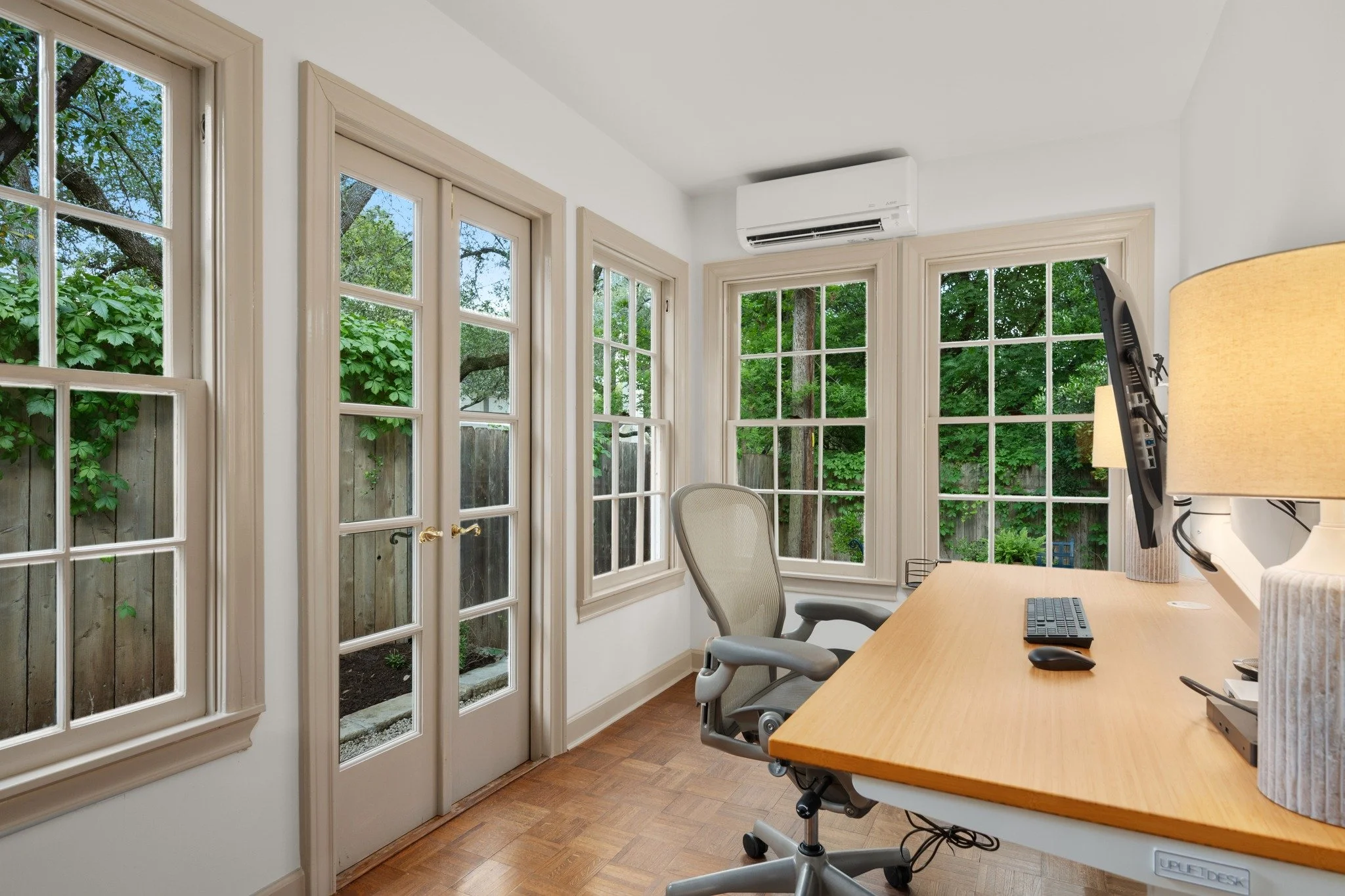 Inside, herringbone wood floors greet you at the entry, setting a tone of craftsmanship and quiet sophistication. At the front of the home, the spaces are intimate and intentional. The dining room is wrapped in rich color, creating a warm and memorable setting for gathering, while the conversation parlor offers a more private place to relax, read, or connect.