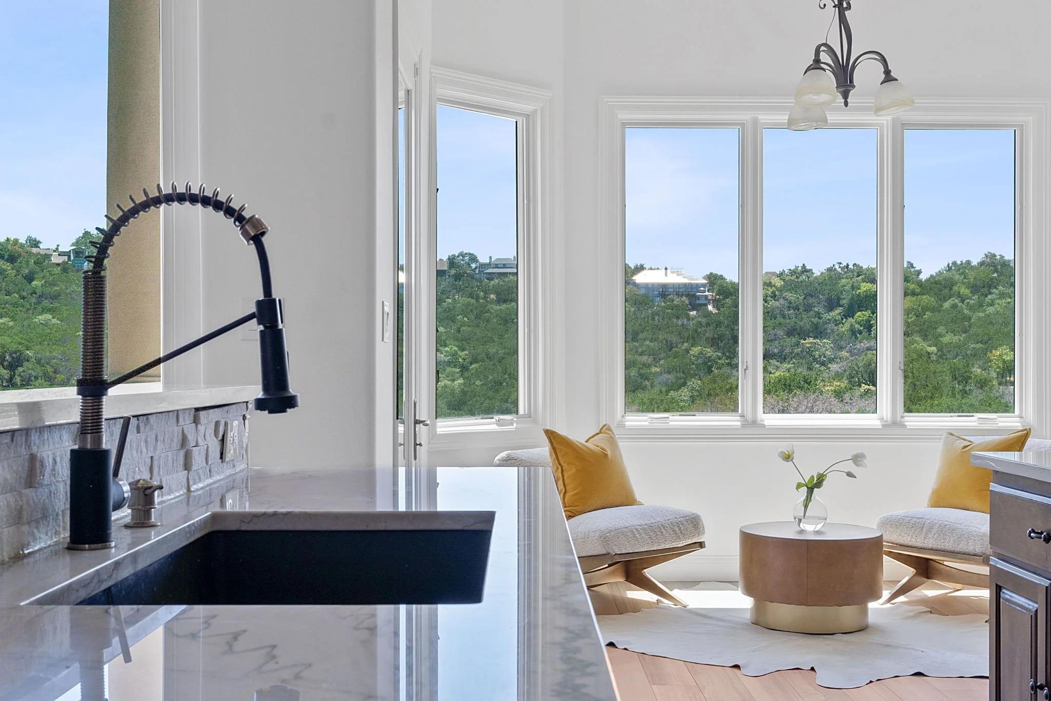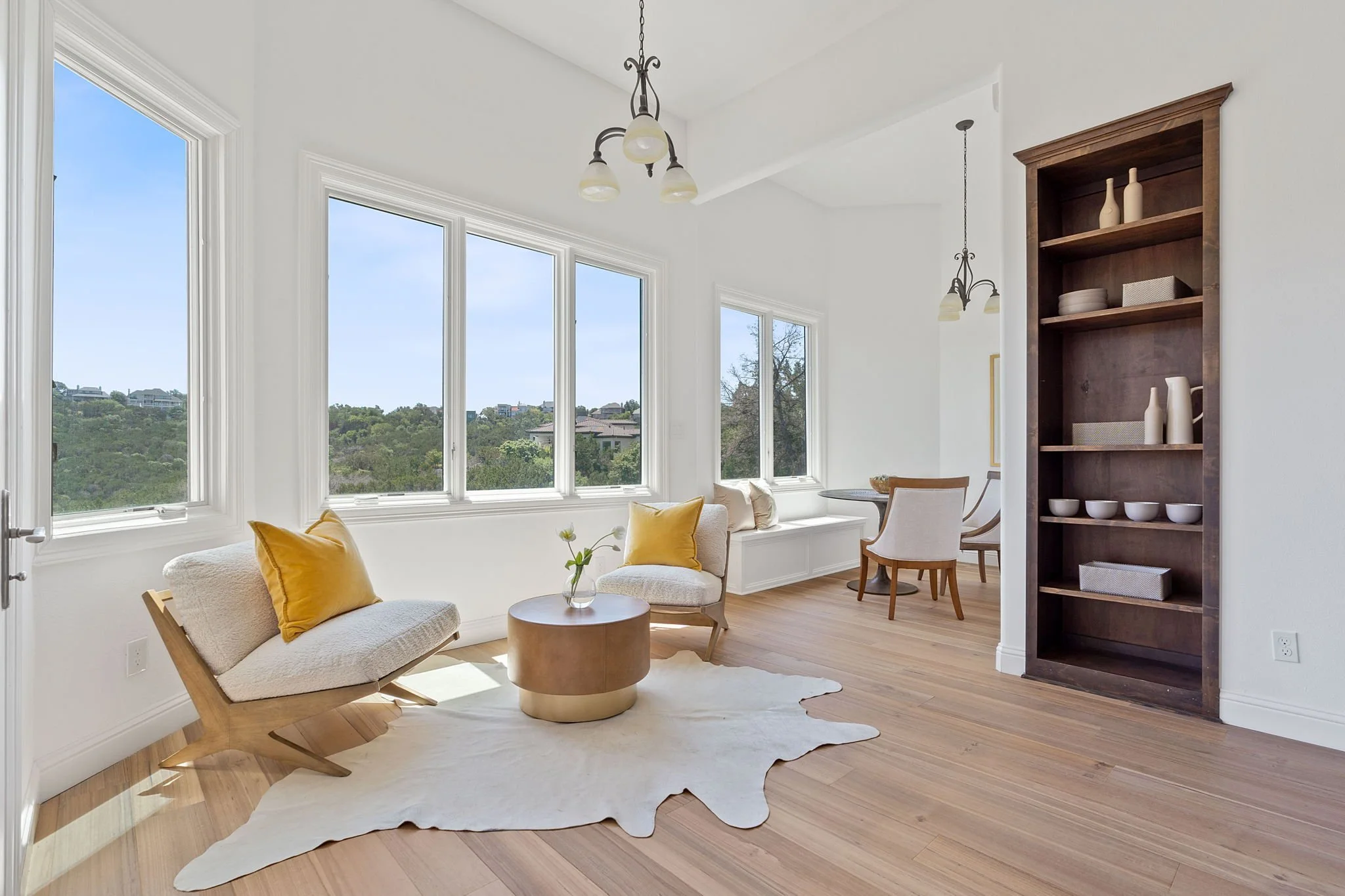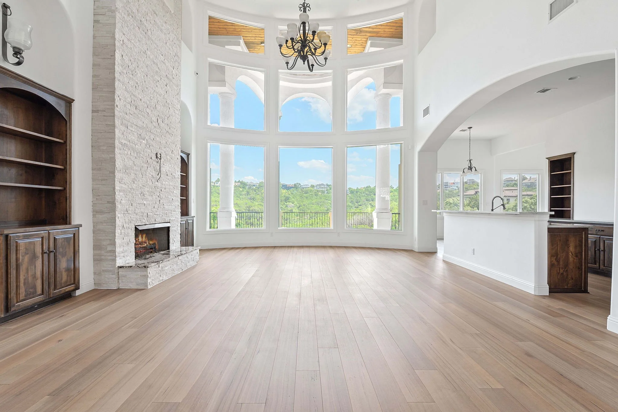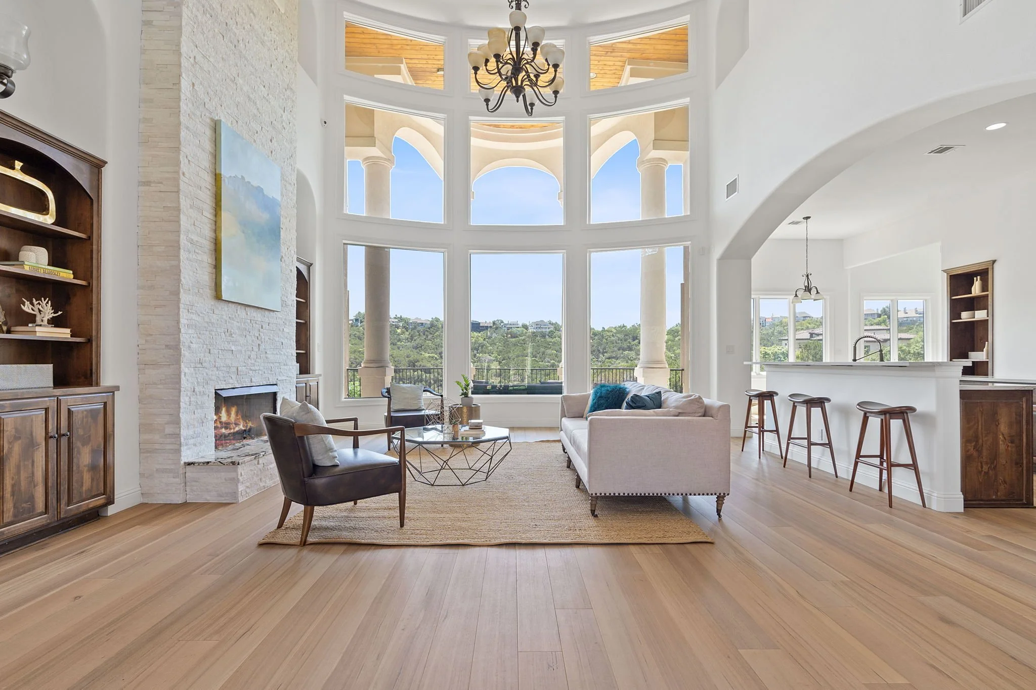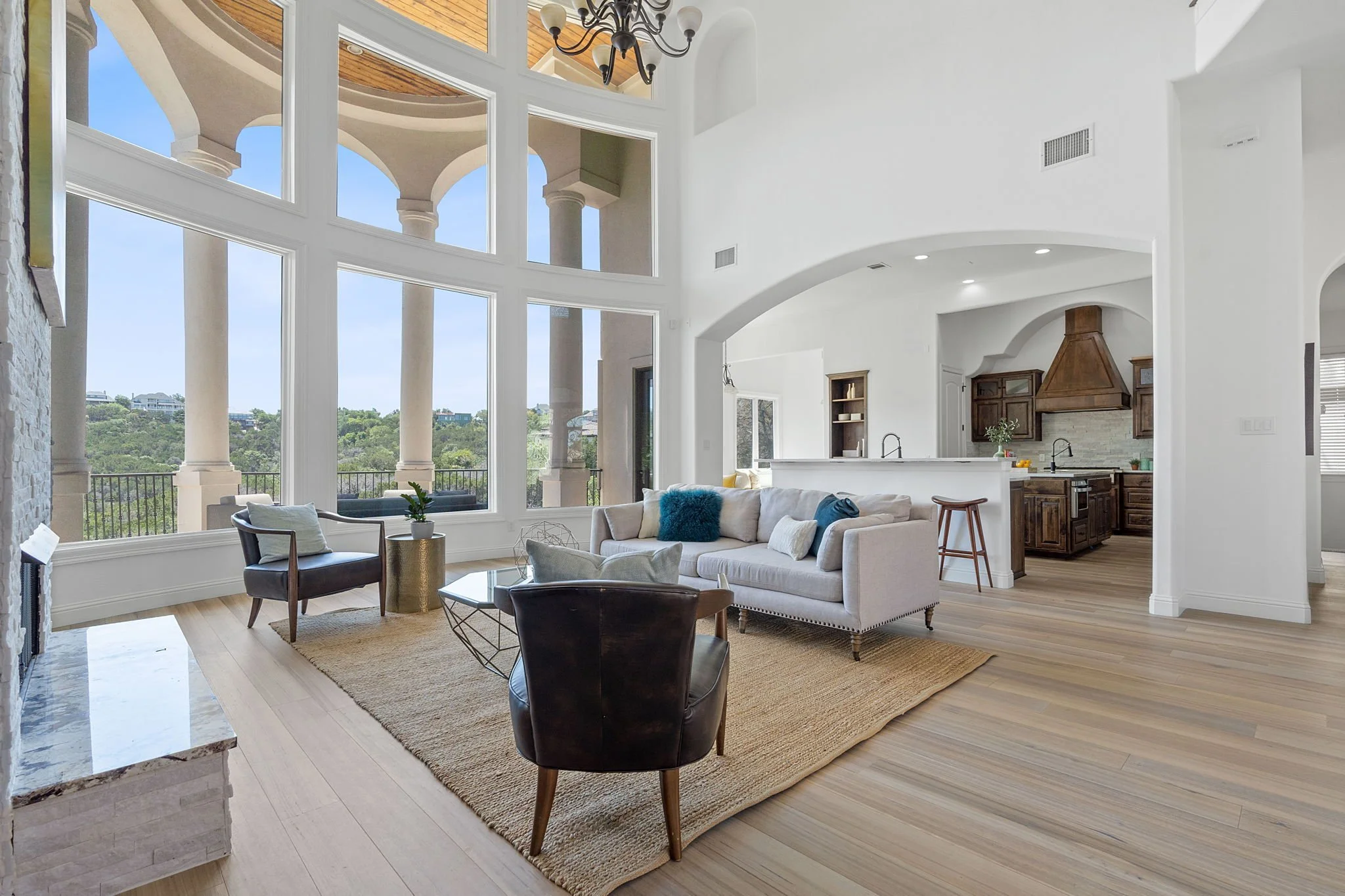 This Northwest Hills residence is all about the view. Designed to draw your eye outward, the home opens up to wide greenbelt vistas that stretch across the entire back of the property creating a serene backdrop for everyday living and entertaining. From the front entry, a private courtyard sets the stage before you step inside to find soaring ceilings and two full stories of windows framing the outdoors. Warm custom wood floors and a dramatic floor-to-ceiling fireplace anchor the main living area, while the open kitchen, dining room, and breakfast nook flow seamlessly together, ideal for gathering with family or hosting friends against the backdrop of the hillside.