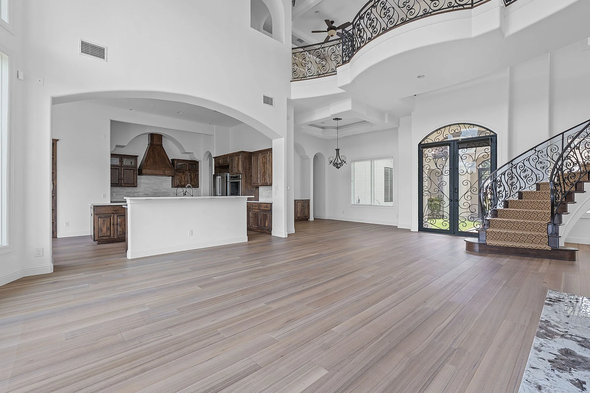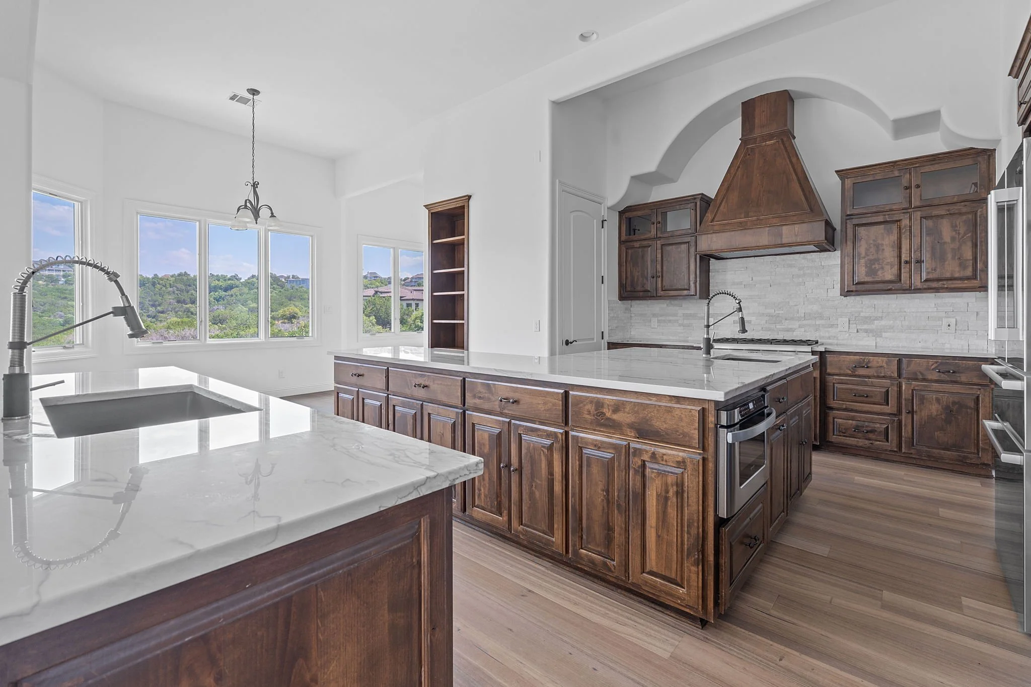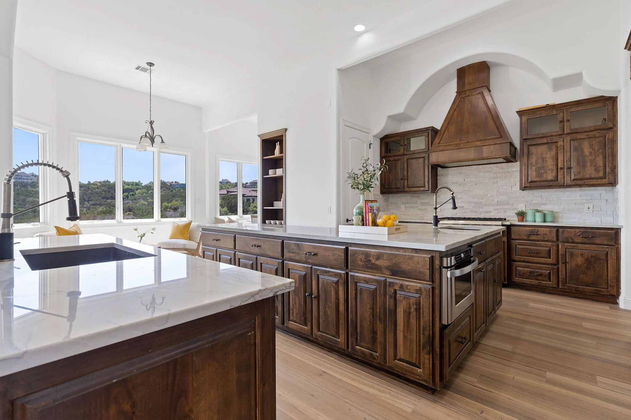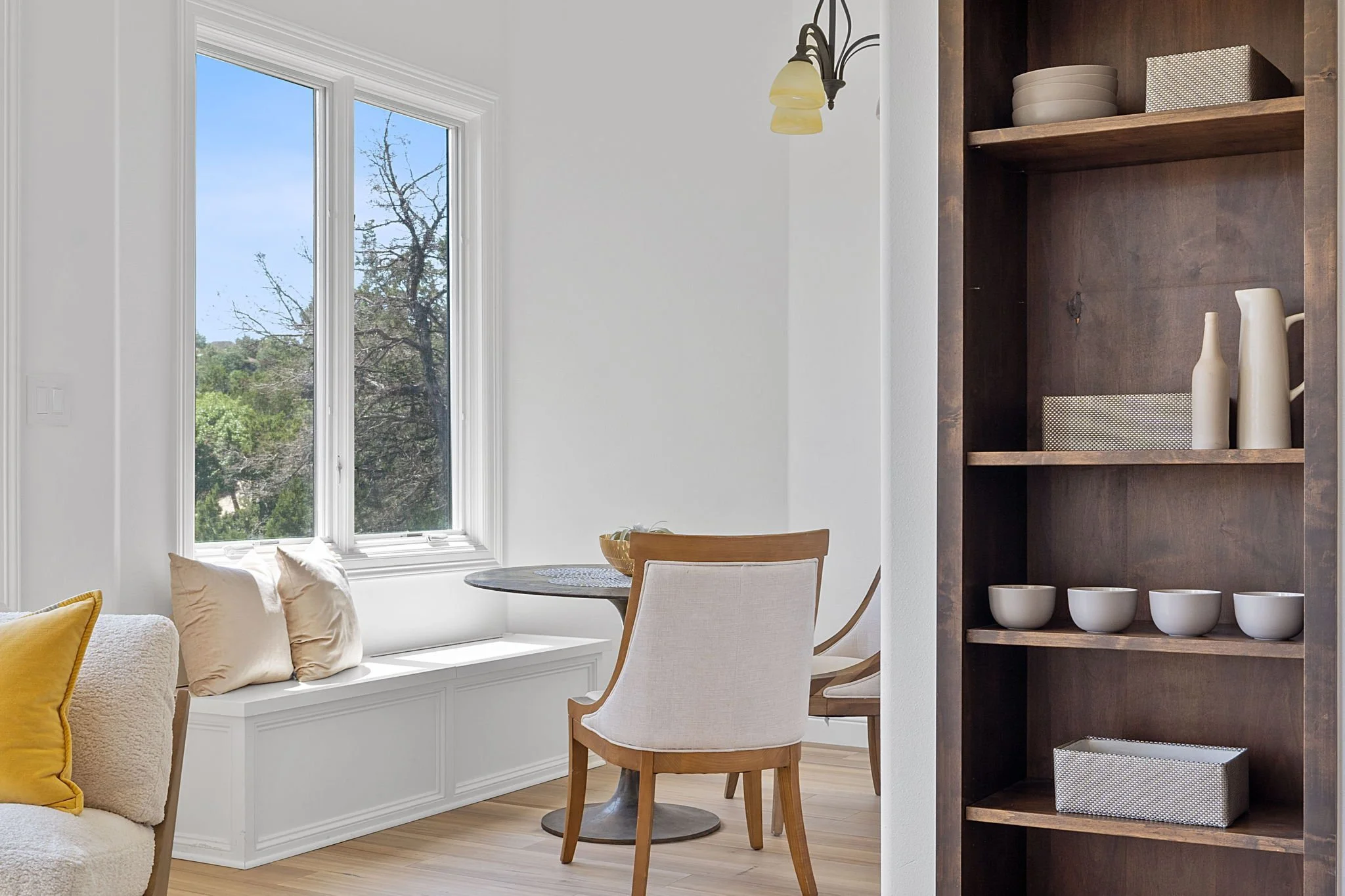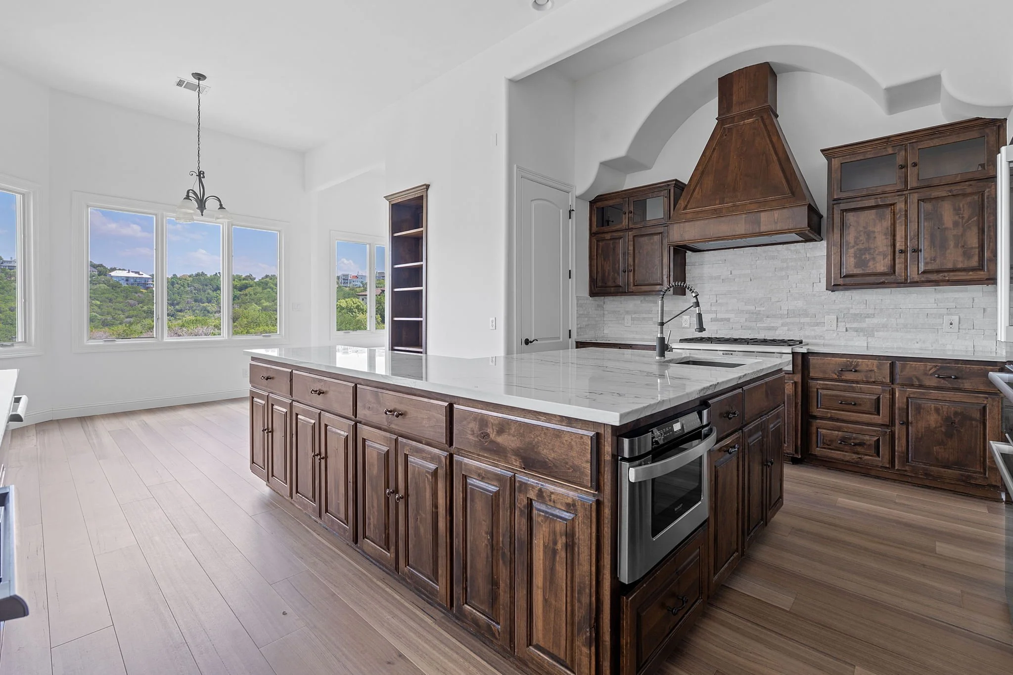 This Northwest Hills residence is all about the view. Designed to draw your eye outward, the home opens up to wide greenbelt vistas that stretch across the entire back of the property creating a serene backdrop for everyday living and entertaining. From the front entry, a private courtyard sets the stage before you step inside to find soaring ceilings and two full stories of windows framing the outdoors. Warm custom wood floors and a dramatic floor-to-ceiling fireplace anchor the main living area, while the open kitchen, dining room, and breakfast nook flow seamlessly together, ideal for gathering with family or hosting friends against the backdrop of the hillside.